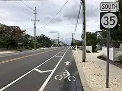 Route 35 begins at the entrance to Island Beach State Park in Berkeley Township, Ocean County, at the southern tip of the Barnegat Peninsula. South of Seaside Park, Route 35 is Central Avenue as it is the only road while it travels along the shore of the Peninsula. It heads north, varying between a two-lane road to a four-lane divided highway with parking spaces in the median and bike lanes on the outside through residential areas of South Seaside Park.[2] It briefly becomes an undivided highway before crossing into Seaside Park, where the route becomes four-lane, divided Central Avenue, which also has median parking spaces. Route 35 passes by residences in Seaside Park, with the median widening for the Seaside Park Police Department building at the intersection of 6th Avenue, and then the road widening to six lanes further north.[1][2] Upon crossing the intersection of Decatur Avenue, the southbound lanes of Route 35 run one block to the west of the northbound lanes and then turns to the west, bypassing Seaside Heights, a beach resort that has a boardwalk and an amusement pier. There, Route 35 turns north and has an interchange with the eastern terminus of Route 37 on the Seaside Heights/Berkeley Township border on the eastern shore of the Barnegat Bay. At this interchange, a ramp provides access from northbound Route 35 a short distance past the ramp from eastbound Route 37 to Seaside Heights, connecting to Sumner Avenue.[1][3]
