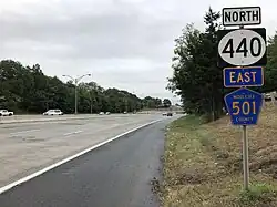 Route 440 begins in Edison at an interchange with the southern terminus of I-287 and the New Jersey Turnpike (I-95); from Route 440's southern terminus, the road becomes northbound I-287. Within this interchange, Route 440 also has access to County Route 514 (CR 514).[1] It continues to the east as a six-lane freeway through wooded surroundings and enters Woodbridge Township at the underpass of King Georges Post Road. Here, the route intersects Smith Street (CR 656) before intersecting the Garden State Parkway and US 9 at a large interchange. Within this interchange, the route passes under Conrail Shared Assets Operations' (CSAO) Raritan Industrial Track line.[1][3] From here, the route turns northeast and passes under CSAO's Perth Amboy Running Track line before it enters Perth Amboy at the point where it crosses under New Brunswick Avenue (CR 616).[1] Route 440 passes near homes before coming to the next interchange for CR 501 and Route 184.[1][3] At this point, CR 501 joins Route 440 to run concurrently, and the freeway comes to an interchange with Route 35 a short distance later.[1] The route continues east-southeast, with an exit for Amboy Avenue (CR 653) before it passes through more residential neighborhoods.[1][3] The final exit on the Middlesex County portion of Route 440 serves State Street (CR 611).[1] Past this interchange, Route 440 becomes the Outerbridge Crossing, a four-lane bridge maintained by the Port Authority of New York and New Jersey (PANYNJ). It passes over NJ Transit’s North Jersey Coast Line and State Street before crossing over the Arthur Kill onto Staten Island. At the New Jersey-New York state line on the middle of the bridge, the southern segments of Route 440 and CR 501 end and become NY 440.[1][3] An extension of Route 440 also intersects with Route 35 right after the Victory Bridge crossing in Perth Amboy (around ShopRite) [4]