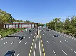 Immediately north of the toll barrier, the road divides into a local-express lane configuration with two express and three local lanes in each direction. The parkway passes to the east of a solar farm before reaching an interchange with Route 18 and Route 36, which head north towards New Brunswick and east towards Long Branch, respectively. The connector road from the parkway to the western terminus of Route 36 and Hope Road (CR 51) is designated by the New Jersey Department of Transportation as Route 444S.[9] North of the interchange, the Garden State Parkway passes over the Southern Secondary railroad line operated by the Delaware and Raritan River Railroad and bisects residential neighborhoods before crossing the Swimming River into Middletown Township, where the road has an interchange with CR 520, which contains a park and ride and serves Red Bank and Lincroft. The parkway then passes over Normandy Road, which serves as a road and railroad link between the two sections of Naval Weapons Station Earle. Continuing northwest past houses and parks, the route has an interchange with Red Hill Road (CR 52) as it enters Holmdel Township, where it serves the PNC Bank Arts Center and the New Jersey Vietnam Veterans' Memorial. Upon entering Hazlet, the parkway crosses NJ Transit's North Jersey Coast Line before reaching an interchange for Route 35 and Route 36, which serves Keyport. At this point, the express roadway in each direction gains a third lane. Immediately north of here is a southbound exit and entrance at Lloyd Road (CR 3), where the parkway briefly enters Aberdeen Township and passes over the Matawan Creek before crossing the North Jersey Coast Line for a second time while the southbound lanes of the parkway briefly enters Matawan. Upon entering Old Bridge Township, Middlesex County, and reaching an interchange for Matawan Road (CR 626) serving Matawan, the highway enters Cheesequake State Park.[1][3]
