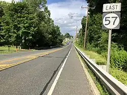 Past this intersection, the road heads northeast through farmland within the Pohatcong Creek valley, situated between Pohatcong Mountain to the south and Scotts Mountain to the north.[3] It enters Greenwich Township, where the route crosses County Route 637 (Liberty Road/North Main Street) before passing through residential areas. Route 57 heads into farmland with intermittent residences, crossing into Franklin Township. The route continues to New Village, where residences become more dense. A short distance after the intersection with County Route 633 (Edison Road), Route 57 heads back into farm fields. The road reaches the residential community of Broadway, where it comes to a junction with County Route 643 (Asbury Broadway Road). Route 57 continues through agricultural areas with more residences and businesses, crossing into Washington Township, where it intersects County Route 648 (Little Philadelphia Road) and County Route 623 (Brass Castle Road).[1][3]