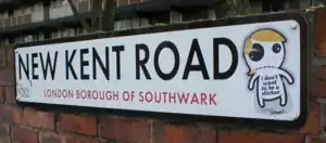 New Kent Road is a 1 kilometre (0.6 mi) road in the London Borough of Southwark. The road was created in 1751 when the Turnpike Trust upgraded a local footpath.[1] This was done as part of the general road improvements associated with the creation of Westminster Bridge; in effect it was possible to travel from the West End/ Westminster to the south-east without having to go via the Borough of Southwark but could now cross St George's Fields to the junction of Newington Causeway and Newington Butts which is where New Kent Road starts at Elephant & Castle. The route runs eastward for a few hundred yards to the junction of Great Dover Street and Tower Bridge Road, known as Bricklayers Arms, where it joins the original route to the south-east Old Kent Road (the A2).
