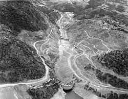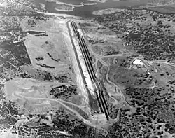 Actual construction began in July 1966 with clearing of the dam and reservoir site, construction of access roads, foundation preparations and excavations for the future outlet works. A diversion tunnel to allow the river to bypass the dam site was excavated between 1966 and December 1973.[9] The Corps opened bids for construction of the main dam on October 10, 1972. Melones Contractors (a consortium formed by Guy F. Atckinson Company, Gordon H. Ball, and Arundel Corp.) won the primary construction contract for $109.7 million, while Allis-Chalmers and General Electric took an $11.5 million contract to provide turbines and hydroelectric generating equipment.[32] During reservoir clearing operations, the USACE spent about $28 million relocating roads and bridges in the future reservoir space.[32] Foundation work for the dam itself began on March 6, 1974 with the first embankment material placed in January 1976.[32] Much of the embankment fill came from an excavation shortly northwest of the dam, which would later serve as the dam's spillway. During the height of construction in the summer, the total workforce reached about 800, while averaging between 500–600 in the winter months.[33]