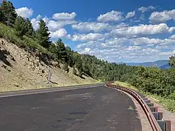 State Road 518 (NM 518) is a 72.899-mile-long (117.320 km) state highway in northern New Mexico. NM 518 begins as a continuation of 7th Street at Mills Avenue near Interstate 25 (I-25) in Las Vegas. It proceeds north to La Cueva where the road turns northwest at its junction with NM 442. The road continues northwest through Mora and eventually ends in Ranchos de Taos at its northern terminus at NM 68. The segment of NM 518 between Mora and Ranchos de Taos passes through the rugged terrain of the Sangre de Cristo Mountains and provides access to Carson National Forest where camping, fishing, skiing, and other recreational opportunities are available.