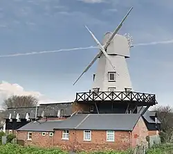 A mill has stood on this site since 1596, and a post mill is known to have been built here in 1758.[2] Gibbet Mill was built in 1824, the name Barry's mill coming from an early miller.[3] The mill was working by wind until 1912, and was used as a bakery until 13 June 1930 when it was burnt down.[2] The new mill was erected in 1932, Neve's of Heathfield being responsible for the millwrighting work.[3]