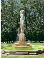 Most of the pieces he created in the garden are either cast concrete, carved limestone, or bronze. These were all popular Art Deco styles of sculpting, and even the pieces he created long past the Art Deco era were modeled in this style. Alferez also has many sculptures located throughout the city of New Orleans, including a local landmark at the Lakeside Airport. The remaining two pieces on the garden grounds were created by Rose Marie Huth in 1942, and Jean Seidenberg in 1962. The more significant of these two pieces is the sculpture by Rose Marie Huth, located near the center of the gardens at the end of the water lily pond. It is a truly remarkable sculpture of a woman riding on top of a large fish, seemingly coasting across the water. This is one of the centerpieces of the Botanical Gardens.