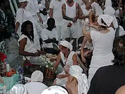 In the 21st century, various Voodoo groups wear white clothing for their ceremonies.[21] Influenced by Haitian Vodou, those assembled may dance around a central post, the poto mitan.[22] Patterned flags, called drapos, may be brought out, while songs are sung in Haitian Kreyol.[22] Drawings, called vèvè , may be made on the floor to invoke the spirits.[23] Offerings will be given to the spirits.[24] Contemporary Voodoo rites often entail calling spirits to enter the body of a practitioner, through which they can heal or confer blessings.[25] The possessed individual will be called the "horse".[24]