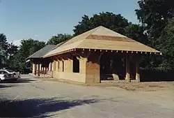 The original New Paltz station burned down around 4:45 A.M. on April 23, 1907, damaging freight and killing station agent E. J. Snyder's dog. The fire originated in the office stove, and spread rapidly before local fire companies could arrive.[46] A passenger car was used as a temporary station while the building was rebuilt.[47] By late September 1907, the concrete foundation and the framework of the new building had been put in place,[48] but work on the interior did not begin until November because the lumber had not arrived.[49] The depot was completely rebuilt by December 31, 1907,[50] and in active use by February 7, 1908.[51] While the original station had a gabled roof, the rebuilt station was hipped. The direction of the new station's battens was horizontal; the original station had had vertical slats.[20] The rebuilt freight house was placed a distance from the depot.[52]