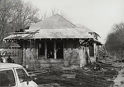 In April 1977, the owner of the property, Fetner and Gold Associates, attempted to open the building as a bar. Their zoning permit was rejected; the village mayor was "unalterably opposed" to the prospect, and the board believed the proposed bar would lead to complaints from nearby apartments. It was also believed that it would be unsafe to open a bar adjacent to an active rail line, and that such a venture would threaten the nearby Huguenot Street Historic District.[61][62] On December 31, 1977, all regular freight service ceased along the Wallkill Valley line.[64] By the early 1980s the depot had become a "hangout for youths to drink and carouse" and the village considered dismantling it.[65] Conrail, at that time the owner of the rail line, removed all tracks along the corridor between 1983 and 1984 and salvaged the steel.[66]
