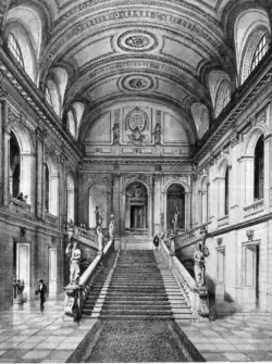 Inside, Hoffmann divided the building into a stage section and an audience section. The audience section forms the center of the building, with a large staircase and a foyer in front of it. Four atriums further divide the building. The central entrance was to be located on Königsplatz, through which one was to enter a transverse vestibule that was to occupy the entire width of the building. A few steps lead to the central staircase or the side corridors. A wide staircase in the central stairwell and further stairs in the side corridors lead to the first tier, and two staircases behind the main hall lead to the upper stalls. The auditorium was to consist of four tiers, spanned by additional rows of seats in the style of an amphitheater; the ceremonial box and the three-part proscenium boxes were architecturally emphasized. A large foyer was to be set up above the entrance hall for breaks, and other common rooms were located throughout the building.