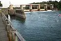 Savannah Bluff Lock and Dam; Dam structure, Gates 1 and 5 open. -