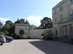 The house consists of a central stuccoed block of three floors with a basement divided into five bays, with a flanking pavilion of two stories in four bays, to either side connected by low flanking quadrant walls. In the centre of the front is a large classical pedimented portico fronted by four Ionic columns. The flanking walls screen the service wings behind. The rear elevation has on either side full-height semi-circular bays. The interior contains much Adam style decorative plasterwork, apparently the work of a certain Mr Powell referred to in the invoice from the builder Bellman,[26] and ornamental fittings. Robert Adam did much work for the Parkers at Saltram House near Plymouth between 1768–72 and 1779–82.[27] The Poles are likely to have been guests at their neighbours at this time, but in any case as they also spent much time in London at their house in Bedford Square, they would have been familiar with Adam's work in London and elsewhere. The north-east pavilion contains a theatre of c. 1900.[28] The top floor housed the servants' quarters.[29] The kitchens were originally situated in the left hand pavilion, later converted into a theatre.[30] A large Palladian style stables block is situated around a semi-circular courtyard, several hundred yards from the house, now converted into several separate residences. It had stabling for twelve horses and accommodation for grooms.