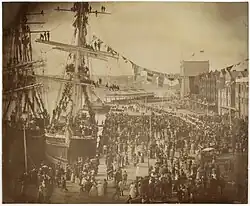 During the early years of the 1880s, an Egyptian regime in the Sudan, backed by the British, came under threat from rebellion under the leadership of native Muhammad Ahmad (or Ahmed), known as Mahdi to his followers. In 1883, as part of the Mahdist War, the Egyptians sent an army to deal with the revolt, but they were defeated and faced a difficult campaign of extracting their forces. The British instructed the Egyptians to abandon the Sudan, and sent General Charles Gordon to co-ordinate the evacuation, but he was killed on 26 January 1885 during the fall of Khartoum. When news of his death arrived in New South Wales in February 1885, the government offered to send forces and meet the contingent's expenses.[1] The British government subsequently accepted the offer, although similar commitments from Victoria, Queensland, and South Australia were declined.[2] The New South Wales Contingent consisted of an infantry battalion of 522 men and 24 officers, and an artillery battery of 212 men, a small field ambulance detachment, and 200 horses, led by Colonel John Soame Richardson, sailed from Sydney on 3 March 1885,[3][4] aboard the ships Iberia and Australasian.[5] A large crowd of more than 200,000 people saw them off, while the dispatch of the contingent was portrayed in a number of contemporary newspapers as the "coming of age" of the Australian colonies.[2]