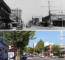 In 1911, the original landowner subdivided the land into residential lots that followed the grid established by neighbouring New Westminster; the first residential home had only been built a year prior. In 1912, the BC Electric Railway took advantage of this by building the "Connaught Hill" station at Tenth Avenue for the new interurban electric tramway, which connected New Westminster with Vancouver.[24] The station was named for Prince Arthur, Duke of Connaught and Strathearn. This station became the namesake for the neighbourhood, while the modern SkyTrain tracks follow the path of this historic tramway.[25][26]