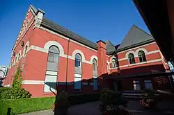 A former Canadian Pacific Railway station is adjacent to the New Westminster Skytrain station. It is a two-storey asymmetrical red brick building with steeply pitched bellcast roofs. The building, which was built in 1899, is a classic example of CPR's signature Château-styled railway stations. In 1911, two wings were added to the station, and in 1973, the ageing train station was converted into a branch of The Keg restaurant chain. In 2013, however, the restaurant closed its doors to the public due to structural issues surrounding the then-114-year-old structure. As of 2023, the train station is occupied by Kelly O'Bryan's, a BC Irish restaurant and pub chain.[32][33]