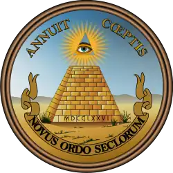 Freemasons rebut these claims of a Masonic conspiracy. Freemasonry, which promotes rationalism, places no power in occult symbols themselves, and it is not a part of its principles to view the drawing of symbols, no matter how large, as an act of consolidating or controlling power.[36] Furthermore, there is no published information establishing the Masonic membership of the men responsible for the design of the Great Seal.[36][37] While conspiracy theorists assert that there are elements of Masonic influence on the Great Seal of the United States and that these elements were intentionally or unintentionally used because the creators were familiar with the symbols,[38] in fact, the all-seeing Eye of Providence and the unfinished pyramid were symbols used as much outside Masonic lodges as within them in the late 18th century. Therefore, the designers were drawing from common esoteric symbols.[39] The Latin phrase "novus ordo seclorum", appearing on the reverse side of the Great Seal since 1782 and the back of the one-dollar bill since 1935, translates to "New Order of the Ages",[1] and alludes to the beginning of an era where the United States of America is an independent nation-state; conspiracy theorists often mistranslate it as "New World Order".[2]