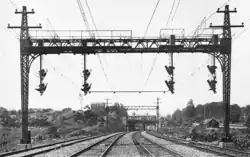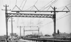 The NYW&B powered its equipment by overhead lines carrying 11,000 volts alternating current at 25 Hz, the same as the New Haven. The New Haven's Cos Cob plant generated the power, which the NYW&B received at New Rochelle.[6]