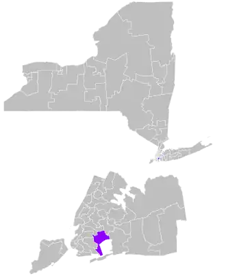 The district overlaps with New York's 7th, 8th, 9th, and 11th congressional districts, and with the 41st, 42nd, 45th, 54th, 55th, 58th, 59th, and 60th districts of the New York State Assembly.[6]