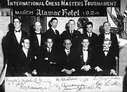 New York 1924 was an elite chess tournament held in the Alamac Hotel in New York City from March 16 to April 18, 1924. It was organized by the Manhattan Chess Club. The competitors included world champion José Raúl Capablanca and his predecessor Emanuel Lasker. Nine other top players from Europe and America were also invited. Emanuel Lasker met Alexander Alekhine, Efim Bogoljubow, Géza Maróczy, Richard Réti, Savielly Tartakower and Fred Yates in Hamburg. They steamed with the SS Cleveland on February 28, 1924, and joined Capablanca, Frank Marshall, Dawid Janowski and Edward Lasker in New York. The tournament was played as a double round robin, with each player meeting every other one twice. Emanuel Lasker won $1500 for first prize, plus generous payment for travel expenses. Capablanca won $1000, compensation for expenses, and an extra payment.[1]