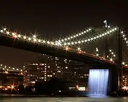 New York City Waterfalls is a public art project by artist Olafur Eliasson, in collaboration with the Public Art Fund, consisting of four man-made waterfalls placed around New York City along the East River. The most famous was at the Brooklyn Bridge in lower Manhattan.[1][2] At $15.5 million, it is the most expensive public arts project since Christo and Jeanne-Claude's installation of The Gates in Central Park.[2][3] The waterfalls officially began flowing on June 26, 2008. They ran from 7 am to 10 pm (under illumination after sunset), until October 13, 2008.