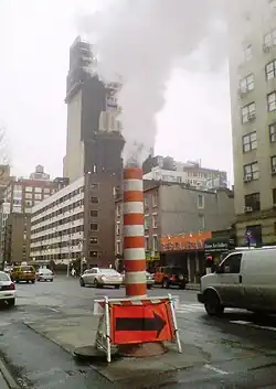 At least twelve steam pipe explosions have occurred in New York City since 1987.[9] The most recent major incident was the 2018 steam pipe explosion which occurred in the Flatiron District and forced the evacuation of 49 buildings.[10][11] The explosion released concrete, asphalt, "asbestos-containing material" and mud into the air. The asbestos was cleaned out of the air to a safe level.[12][13] A previous incident was the 2007 New York City steam explosion, and another on June 28, 1996, at a plant on East 74th Street.[14]