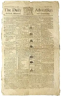 Childs was the printer and publisher of The New York Daily Advertiser, the third daily newspaper paper to appear in the United States.[6] Its first issue was published on Thursday, March 1, 1785, with its final issue appearing on August 30, 1806.[8] Since it was an independent upstart newspaper it realized a low subscription rate in its early days and attracted few advertisers. In an earnest effort to attract more advertising, Childs sold advertising space at the low rate of three shillings per ad.[6] During the ratification debates over the proposed United States Constitution in 1788 and 1789, The New York Daily Advertiser featured essays, which came to be known as The Federalist Papers, in support of that constitution.[9]