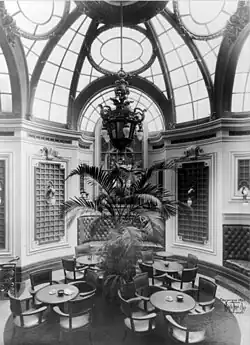 At the rear of the grill room were glass doors,[43][47] which led to a billiards room with four billiards tables and another large fireplace.[43][48] The billiards room was wainscoted in dark oak, and the walls above the wainscoting were covered with green burlap panels.[25] When the billiards room was converted to a bar, the glass doors were replaced with a wall.[43] Above the billiards room was a cafe.[18][19][43] A curved double stair connected the cafe and billiards room.[25][43] The cafe originally contained green leather furniture but was converted into a sailing-trophy room after World War II. The trophy room is circular in plan, measuring 25 feet (7.6 m) across, with a double-height domed ceiling.[43] A bronze-and-gold chandelier hangs from the center of the dome.[33][42] The walls of this room are made of Caen stone and originally contained mirrored glass panels, held into place by mullions.[25][33] Another staircase leads up to the second-story landing of the clubhouse's main staircase.[25]