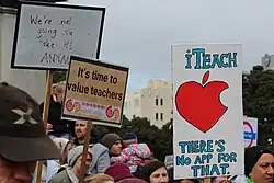 Members struck in 2018 as part of the negotiation round with the Sixth Labour Government of New Zealand. Rallies and marches were held in the major cities.[7] On 29 May 2019, the NZEI and the PPTA stage a mega strike demanding higher salaries, rejecting the Government's three-percent pay rise offer.[10][11][12]