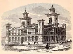 A low-level site on King Street was secured and a contract to erect the main building was let to George Cornwell and Edward Horsman on 11 November 1863, for £10,250. There was a large two-storey stone Italianate building with clock tower and a series of annexes all designed by Mason and Clayton,[6] with a central courtyard derived from Fowler's design of Covent Garden market.[7] It was not completely finished when the fair opened.[6]