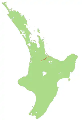 About a quarter of the way up the Kaimai's, SH 29 passes the Ruahihi Power Station and crosses the Wairoa River. About halfway up the Kaimais, the highway travels through the small village of Lower Kaimai. Once at the Kaimai Summit, SH 29 descends steeply to the Waikato region. After passing a junction with SH 28, SH 29 reaches a T-Junction with SH 24. Due to the layout of the junction, traffic wishing to stay on SH 29 must turn at this junction. 4 km after the junction, SH 29 reaches the village of Te Poi. SH 29 crosses SH 27 at a staggered T-Junction before entering the village of Hinuera. SH 29 then runs through the Hinuera Gap, which the Waikato River used to flow through until volcanic debris altered its course 20,000 years ago.[2] SH 29 terminates at a T-Junction with SH 1 near Piarere.