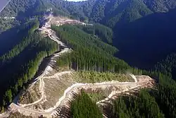 Plantation forests of various sizes can now be found in all regions of New Zealand except Central Otago and Fiordland. In 2006 their total area was 1.8 million hectares, with 89% in Pinus radiata and 5% in Douglas fir (Pseudotsuga menziesii)[57] Log harvesting in 2006 was 18.8 million m3, down from 22.5 million m3 in 2003. This is projected to rise as high as 30 million m3 as newer forests mature. The value of all forestry exports (logs, chips, sawn timber, panels and paper products) for the year ended 31 March 2006 was $NZ 3.62 billion. This is projected to rise to $4.65 billion by 2011. Australia accounts for just over 25% of export value, mostly paper products, followed by Japan, South Korea, China and the United States.[57] Within the New Zealand economy, forestry accounts for approximately 4% of national GDP. On the global stage, the New Zealand forestry industry is a relatively small contributor in terms of production, accounting for 1% of global wood supply for industrial purposes.[58]