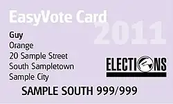 Enrolled voters are sent an EasyVote pack by post after nominations close. The pack contains an EasyVote card, which has the voter's name, address and location on the electoral roll (electorate, page number and line number), which the voter gives to the issuing officer to assist in finding the voter on the printed electoral roll. The EasyVote Card is optional, and voters can simply state their name and address to the issuing officer.[42][48] The EasyVote pack also contains a list of candidates in the voter's electorate, a copy of the party lists, a list of voting places for the voter's electorate and their opening hours, and a brochure on how to vote and the MMP voting system.
