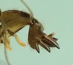The mole cricket was well known to Māori, who encountered it when cultivating garden plots and called it honi.[2] Mole crickets collected in New Zealand were assumed to be the European species Gryllotalpa vulgaris (a synonym of Gryllotalpa gryllotalpa), which has a wingless nymph that resembles the adult New Zealand species.[3] Triamescaptor aotea was named and described by Norman Tindale in 1928 from two specimens collected in 1915 at Aramoho, Whanganui.[1] It is the only species in its genus, and the only genus in tribe Triamescaptorini.[4] Its closest relatives are two Australian species of Gryllotalpa.[5] Triamescaptor is sometimes incorrectly spelled "Trimescaptor" in later publications.[6]