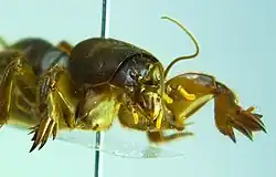 Triamescaptor aotea is 20–30 millimetres (0.79–1.18 in) long, and medium to dark brown in colour, with distinct protruding antennae and long rear processes (or cerci). Its rear cerci are sensory, and in its tunnel it is able to move backwards as easily as forwards. The first segment of its thorax is extended, rounded, and armoured. Its front legs are heavily modified for digging, flattened and shovel-like, with just three claw-like processes or dactyls on its tibia (Gryllotalpa has four),[7] two movable and one fixed.[1]