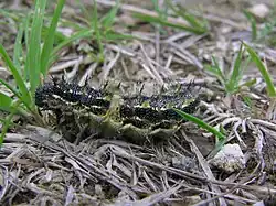 Larvae go through five growth stages (called instars). For about 10 days they have a brown body with small white spots and fine hairs (setae). At about 2.5 mm they moult and during this stage develop a pale stripe along the body just above the legs. The setae start to develop spikes, usually two or more at this stage. At about 5 mm long they moult again and the pale longitudinal lines become more obvious. At about 10 mm they moult once more, and the setae develop more spikes.[2] The last moult is at about 22 mm, from where caterpillars grow to about 36 mm before pupating into a roughly 20–mm pupa.[1]