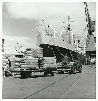 ![]() A shipment of wool being loaded in Wellington, in the mid-1960s | |