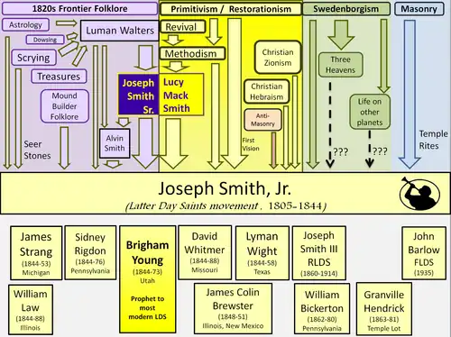 Swedenborgism influenced the Fox Sisters's Spiritualism as well as Joseph Smith's Mormonism.[7][8] Spiritualism influenced Paschal Beverly Randolph founder of Fraternitas Rosae Crucis, and Helena Blavatsky, the founder of Theosophy. Blavatsky was influenced by the work of Éliphas Lévi.[9] Aleister Crowley and Jack Parsons's Thelema were influenced by Theosophy and Levi. Thelema influenced Anton LaVey's Satanism and L. Ron Hubbard's Scientology.[10]