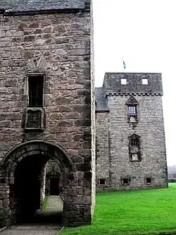 The central part of the mansion has cellars with tiny windows under a main hall with large windows, and other accommodation above that. An east wing with the main entrance door close to the main block links it to the original tower house which was suitably modified, and a short west wing connects to the gatehouse. The mansion has features of the Scottish baronial style including crow-stepped gables and north corners embellished with corbelled turrets. At the centre of its north wall a stairwell supported out on corbelling gives access to the upper floor.