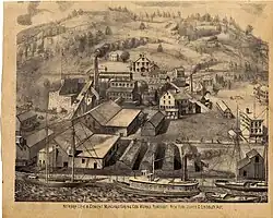 According to Hamilton Child, the Newark Lime and Cement Manufacturing Company was the most important manufacturing establishment in Rondout, and began operation in spring 1851. The company owned 250 acres including waterfront on the channel of the Rondout Creek. The Rondout Manufactory alone produced 227,516 barrels. The works consisted of twenty-one kilns for burning the stone, two mill buildings, four storehouses, capable of storing upwards of 20,000 barrels, a cooperage establishment, millwrights', wheelwrights', blacksmiths', and carpenters' shops, barns stables. Stone, from which the cement was made, was quarried from the hill immediately in the rear of the factory, and was obtained by tunneling and sinking shafts, from which extend galleries in the stratum of cement rock, which inclines to the north-west. An extensive system of railways transported the stone from the quarries to the top of the kilns, where it was burned by being mixed with culm or fine coal, and then passed by a series of descents through the various stages of manufacture till it arrived in barrels at the wharf ready for shipment. As the cement manufactured often exceeded 1,000 barrels per day, the deficiency in barrels was supplied from the stock accumulated during the season when navigation was closed, and the manufacture of cement necessarily suspended. The number of men employed varied from 250 to 300.[2]
