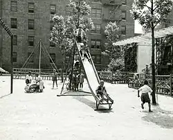 Sanitary conditions were bad throughout urban America in the 19th century, but Newark had an especially bad reputation. The city lacked the bold leadership and imagination seen in other cities in addressing urban problems. For most of the 19th century, city leaders allowed the business elite and private interests to formulate civic policy and run public agencies in pursuit of unfettered growth and industrialization. This led to multiple issues such as a lack of any urban planning and park construction, the accumulation of human and horse waste build up on unpaved city streets, the over reliance on cesspools and wells followed by the city's inadequate, poorly designed and haphazardly constructed sewage system, and the unreliability and dubious quality of its water supply. Newark did not have a proper public medical center or hospital until 1882, relying on neighboring cities and private medical facilities for emergency care.[29] By 1890, Newark had the highest rate of death for cities of over 100,000 people, led the nation in deaths by scarlet fever and had the highest rate of infant mortality in the United States. Newark also ranked in the top ten of cities for diseases such as croup, diphtheria, malaria, tuberculosis and typhoid fever. As a result, that year the United States Census Bureau declared Newark "the nation's unhealthiest city."[30][28]
