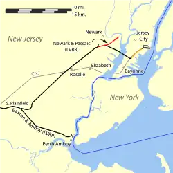 The Newark and Passaic Railway was incorporated on Nov 22, 1889 by the Lehigh Valley Railroad (LVRR). It was chartered as a short line in Newark, New Jersey from the Passaic River to a connection with the LVRR's Newark and Roselle Railway near Pennsylvania Avenue in Newark. The lower mile of its length closed a gap in the route of the LVRR from South Plainfield to Jersey City.
