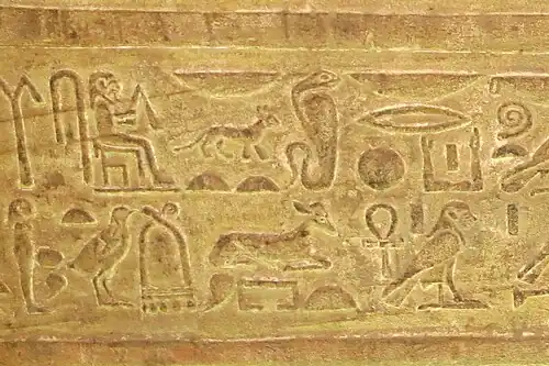 The Newborn calf (hieroglyph) is Gardiner's sign listed no. E9, in the series of mammals. The hieroglyph represents any newborn animal, and specifically the calf as the hieroglyph. In Egyptian hieroglyphs, the hieroglyph is used for the phonetic value of iu,[1] as well as a determinative. Budge's vocabulary dictionary for the Book of the Dead has about thirty entries[2] that start with newborn calf, "iu". They relate to conceiving, crying-out (as young creatures do), and other related items. When used with the "bone-with-meat" hieroglyph