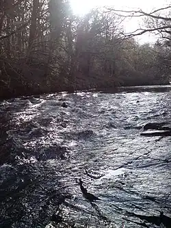 Newbridge is a recognised British Canoe Union access and egress point for kayakers and canoeists. The creation of bank reinforcements and steps leading down to the river have been overseen by the BCU. The bridge marks the end of The Upper section and beginning of The Loop. A nearby rock ledge, known as "The Slab" is used as a visual guide to the river level.[5]