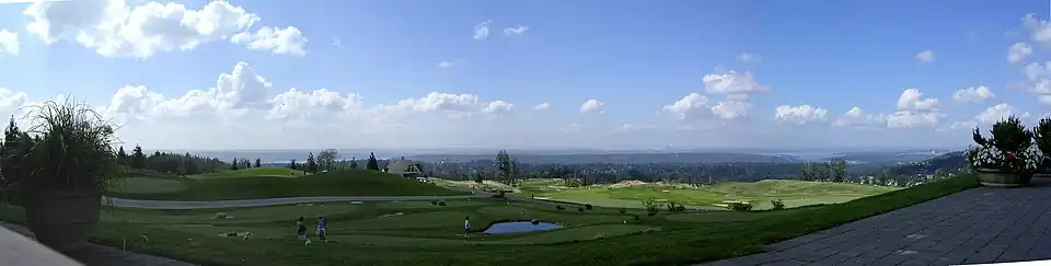 Newcastle is known for its 36-hole, 350-acre (140 ha) golf complex, which features two championship, 18-hole courses known as the Coal Creek and China Creek courses. Designed by golf course architect Robert E. Cupp in consultation with PGA Masters champion Fred Couples and in partnership with Oki Golf, the courses have views of Mount Rainier, Lake Washington, Lake Sammamish, the Olympic and Cascade mountain ranges, and the downtown skylines of the cities of Seattle and Bellevue. Practice and hospitality facilities include a heated driving range, a pro shop, an 18-hole mini-golf/putting range, private (pitching/putting/chipping) practice tees, and a 44,000-square-foot (4,100 m2) clubhouse with restaurants, pubs, and event spaces.[30]