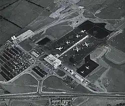 In 1929, Newcastle-upon-Tyne City Council set up a special committee to investigate the potential for building an airport to serve the North-East of England, considering 18 locations before selecting a site at Woolsington, about 5 mi (8.0 km) northwest of the city centre.[5] The airport was opened on 26 July 1935 as Woolsington Aerodrome by the Secretary of State for Air, Sir Phillip Cunliffe-Lister. Incorporating a clubhouse, hangar, workshops, fuel garage and grass runway, it cost £35,000 to build.[6] The airport became the base for the Newcastle upon Tyne Flying Club, which moved from its previous home at Cramlington Aerodrome and ran the new airport on behalf of the council.[7] On 1 June 1939, No. 43 Elementary and Reserve Flying Training School, operated by Newcastle Flying Club and equipped with a mixture of de Havilland Tiger Moths, Miles Magisters and Hawker Hinds opened at Woolsington, as one of a large number of civil-operated flying schools set up to train aircrew for the RAF. The school was disbanded on 3 September 1939, with the outbreak of the Second World War.[8][9]