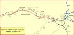 The main line at the eastern end was to cross the Tyne at Scotswood, then follow the north bank of the river closely and at a low level, to a termination at the Close, in Newcastle. There was to be a branch from Elswick Dean to a terminal at Thornton Street.[6] Close, a mononymous road, still exists on the bank of the Tyne between Queen Elizabeth Bridge and High Level Bridge. Thornton Street street also still exists: a northward extension of Waterloo Street northwest of Central station; the location is at a high level and would have required a steep gradient (of about 1 in 50), worked by stationary engine and rope haulage.