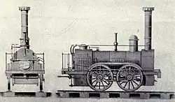 When the line was being planned in 1825, it was decided to arrange it as a toll road, on which any independent carrier might run his vehicles on payment of the toll; and horse traction was intended. By May 1834 this was beginning to look antiquated as other railways, in particular the Stockton and Darlington Railway, had successfully taken the haulage of trains to itself and introduced steam locomotives. On 13 June, therefore, the board of the N&CR decided to adopt the same arrangement and subsequently placed orders for two locomotives, of which one was to be built by R & W Hawthorn Ltd. and the other by Robert Stephenson & Co. The first of these, an 0-4-0 locomotive named Comet was delivered in 1835, closely followed by 0-6-0 Rapid.[13] The company circularised landowners as this was specifically forbidden in the company's act of Parliament; the response was generally favourable or acquiescent, and the company undertook to use coke instead of coal to minimise any smoke nuisance.[1]