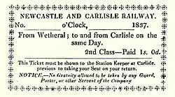 The single-track sections on the line in 1840 were from Stocksfield to Hexham, and from Rose Hill to Milton; on the double track sections the N&CR practised right-hand running. Most stations did not have elevated platforms.[2][23] The track was standard gauge, at first using fish-belly rails of 42 lbs per yard, although by 1837 heavier parallel rails at 47–50 lbs per yard were being installed. The rails were laid on stone blocks, and small coal, cinders and loam were used for ballast.[24] The stations were without platforms, the carriages being lower than those on other railways and provided with footboards. The station at Milton had a stable, the branch line to Brampton being worked by a horse and a "dandy" coach.[25][26]