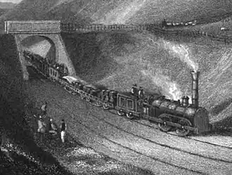 In 1805 William Thomas developed a scheme for a horse-operated plateway (in which the rails are L-shaped, with plain wagon wheels running on the flat part of the rail) between Newcastle and Hexham. This came to nothing, but collieries in the Newcastle area were increasingly turning to ideas of railways and locomotives, and when William Chapman returned to consider linking Newcastle upon Tyne and Carlisle in 1824, it was appropriate to consider a railway as a possible alternative to a canal. He planned to use his earlier canal route for a railway, substituting rope-worked inclined planes for the flights of locks, and found that a railway would be considerably cheaper than the equivalent canal: £252,000 against £888,000.[2] Horse traction was still incorporated into Chapman's railway plans.[1]