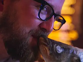 A codfish – or any other fish unsightly enough to suitably replace the cod – is then held up to the lip level of each participant, who then bestows the fish with a kiss. Frozen fish is used most commonly in the screech-ins which take place on George St., though occasionally a fresher specimen, if available, will be used. Some pubs will also award certificates to those who have become an honorary Newfie once the screech-in is complete.[5][6]