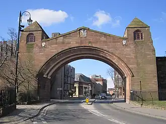 Newgate is an arch bridge carrying the walkway of the city walls over Pepper Street in Chester, Cheshire, England. It is recorded in the National Heritage List for England as a designated Grade II listed building.[1] The bridge was built in 1937–38 to relieve traffic congestion in the city, especially at Chester Cross. This involved making a new breach in the city walls.[2]
